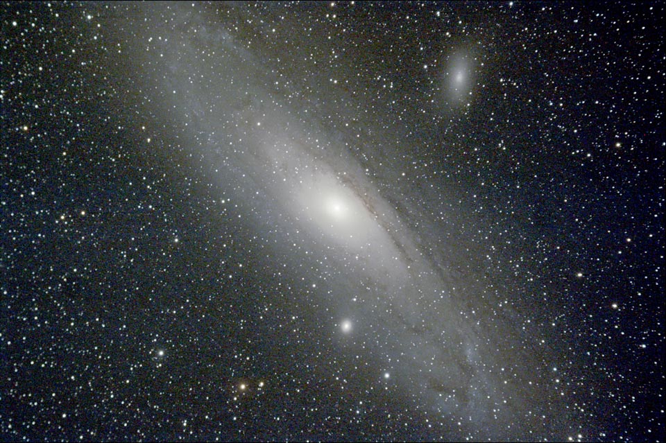 Compared to astro-imaging with digital SLR cameras, which are optimized for ordinary pictures, the StarShoot Pro is a dream to use. Why? Because it is designed for astronomical imaging. It is simple to set up, easy to use, and it requires much less monkeying around with adapters and control wires than do DSLRs. Below are some pictures I have taken. All of those shown were taken with an Orion ED80 (an 80 mm f/7 semi-apochromatic refractor) and many are stacks of between five and twenty-four sub-exposures varying in length from 100 to 500 seconds. In most cases you see the entire 3040x2016-pixel frame resampled to 960x640 pixels. I used my trusty Byers 812 mount with no guiding. |