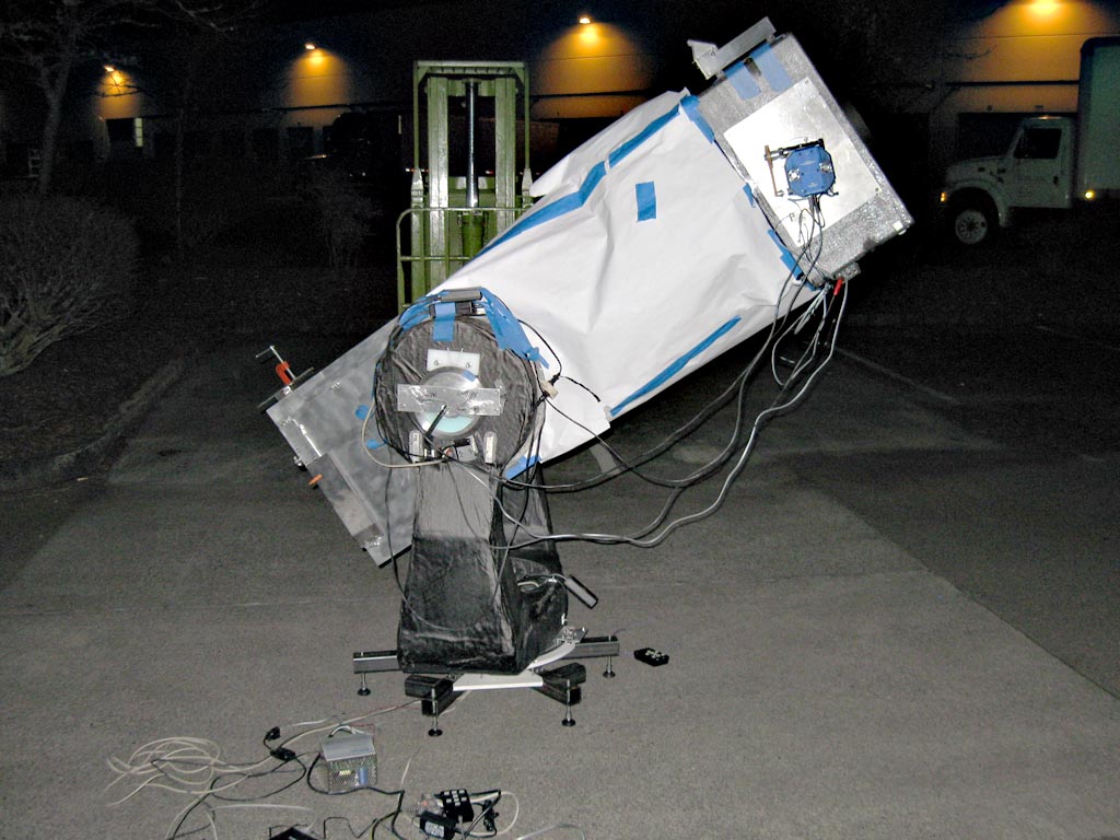 The Cal Poly 18 as it appeared during testing. The temporary paper covering is black on the inside to reduce scattered light from lights on the surrounding industrial buildings. It had gotten quite crinkled, but still manages to keep much of the light from the surroundings from reaching the CCD.