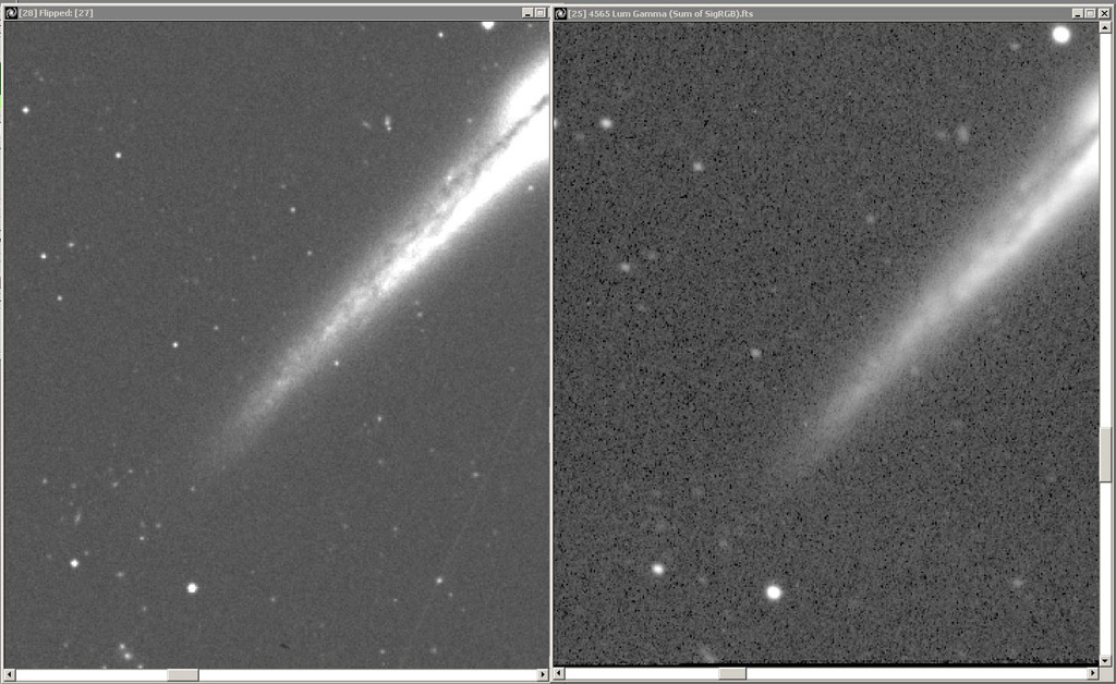 I'll conclude NGC4565 with a comparion between the Digital Sky Survey (left) and the Cal Poly (right). Off the tip of the arm plane you see a faint, distant cluster of galaxies in both images. The POSS/DSS image is deeper and has better spatial resolution, but the Cal Poly picks up images of many faint galaxies that you might not think real if you did not have the DSS comparison.