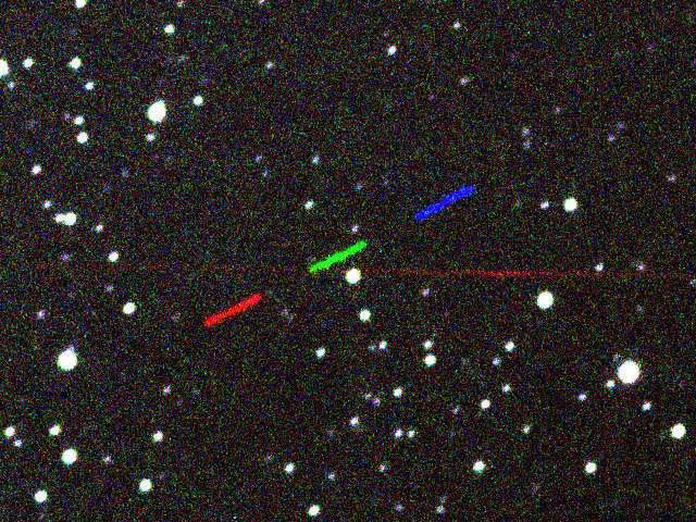 Below is 2012 LZ1 again, but this time you see three consecutive 60-second exposures started 60 seconds apart. The red/green/blue color coding is arbitrary; no filters were used in making the image. The faint red streak is probably a geosynchronous communications satellite.