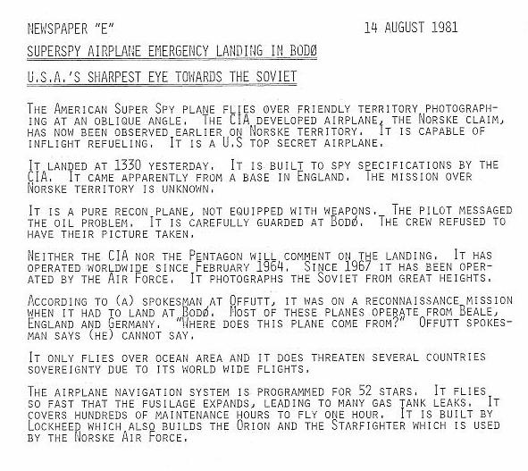 The following Five articles appeared in the Bodo and Oslo, Norway Newspapers upon the arrival of SR-71 #964 on 14 August 1981. The aircraft had developed an engine oil leak and declared an emergency. English translation is included for each Norway news article.