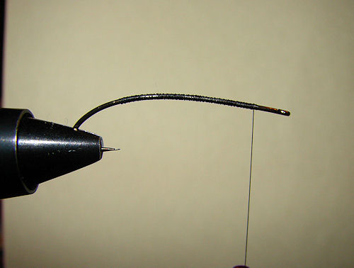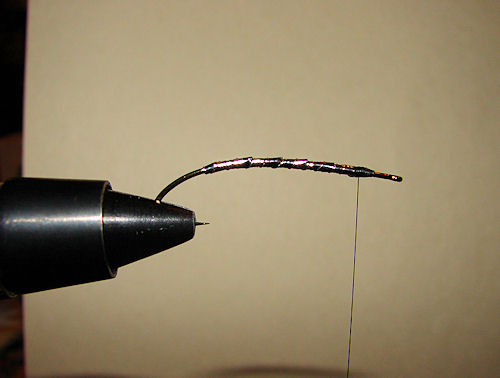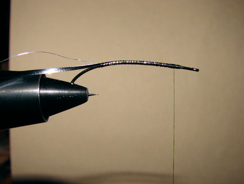 | Step #2 Tie in Ribbing material I tied in the oval and the flat tinsel from the eye to the back, hoping for a nice smooth body.... |