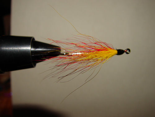 | Step #6 Tie in the Yellow Bucktail portion of the wing, whip finish and apply head cement. Your Fly is complete! |