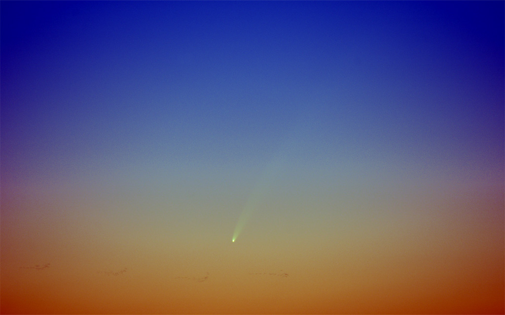This picture is a pretty good representation of the appearance of the comet through a low-power telescope. I took it with a 500 mm telephoto lens. The nucleus appears star-like, enveloped by a nice "parabolic" arc. The tail extends as good part of the distance toward the top of the picture, but it's lost in noise and the brightness of the sky.