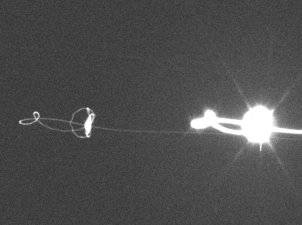 This is another 10-second exposure showing the end of a long slew. This image is cropped at 100% from the original, and is 11.08 arcminutes wide. The tracking leading to the bright star is overexposed, but you can see it making a small overshoot, loop-the-loop, and settling by the trail of the dimmer star.
