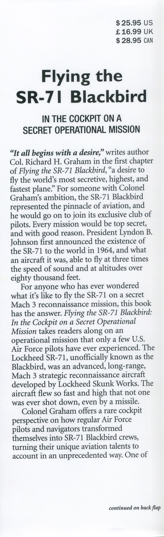 “It all begins with a desire,” writes author Col. Richard Graham in the first chapter of Flying the SR-71 Blackbird, “a desire to fly the world’s most secretive, highest and fastest plane.” For anyone who has ever wondered what it’s like to fly the SR-71 on a secret Mach 3 reconnaissance mission, this book has the answers. Flying the SR-71 Blackbird: In the Cockpit on a Secret Operational Mission takes readers on an operational mission that only a few U.S. Air Force pilots have ever experienced. Col. Graham offers a rare cockpit perspective on how regular Air Force pilots and navigators transformed themselves into SR-71 Blackbird crews, turning their unique aviation talents to account in an unprecedented way. The hardcover book is 288 pages and includes color pictures, diagrams and the first book printing of the SR-71 pilot's checklist."