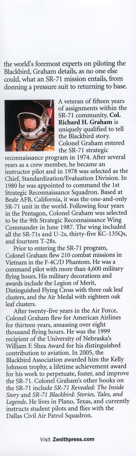 SR-71 Pilot and prior Commander of the 9th Strategic Reconnaissance Wing at Beale AFB in California, Colonel Richard Graham presents his 3rd in depth book on the SR-71. You can step into the cockpit and see what it is like to fly the famous Blackbird on a combat mission. Included in the book is the previously classified pilot's checklist. If you love to fly, you will find this book detailed and humorous but most of all concise and accurate from one of the most respected leaders of the Blackbird family. Proceeds from the sale of this book will go to help restore the SR-71 simulator to operational status. The Sim is located at the Frontiers of Flight Museum in Dallas, Texas. Yes, perhaps eventually you will be able to climb into the cockpit and Sim fly the famous Blackbird. It just doesn't get any better than this. Purchase the book; enjoy the read; then feel confident your purchase has helped establish a precedent for future generations.