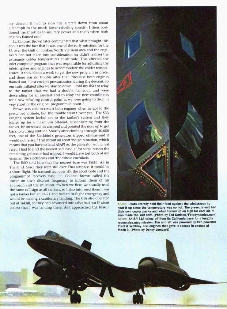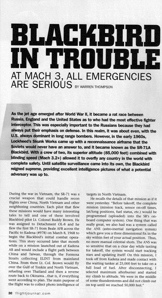 This article was written by Warren Thompson for the February 2010 Issue of Flight Journal. You may obtain a a back issue copy of this magazine by contacting flightjournal.com. Colonel buddy Brown provided the first hand account of his Mach 3 flameout. Photos by Ted Carlson and Lockheed's Denny Lombard.